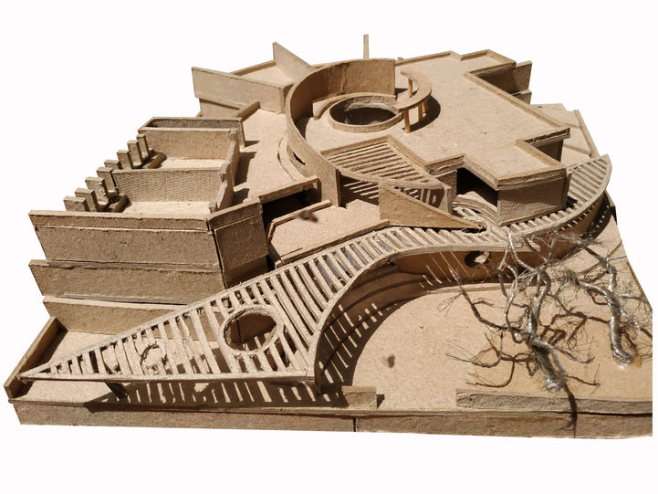 Entrance through a live foyer, well lit spaces ventilated with Venturi effect, classrooms with a connectivity to farming areas, floors arranged on half floor difference to reduce vertical circulation as well as to connect different spaces.