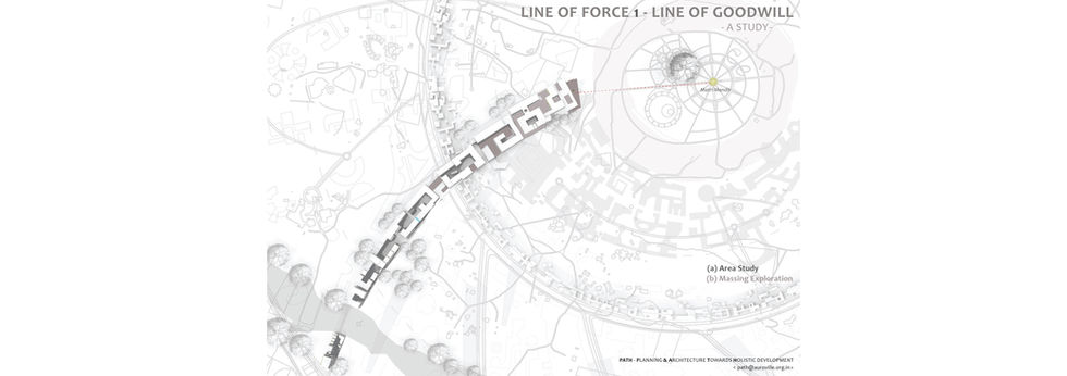 This document for the Line of Goodwill is a study initiated and guided by Helmut Schmid and undertaken by PATH as a base line document required to start the planning and design related work on the LoG by different potential consultants. The study takes a 400x400m square area for documentation and analysis and explores the massing based on the study of sections and the vision given. This makes it an interesting case study having the potential to address numerous issues regarding multiple urban level networks as well as Urban Design of the Township and thereby can be a platform for the framing of various related policies of mixed landuse.